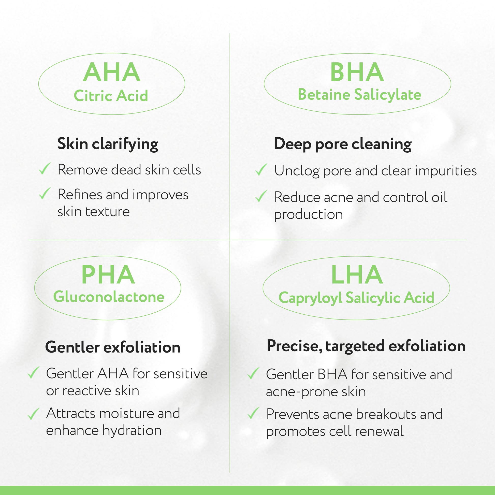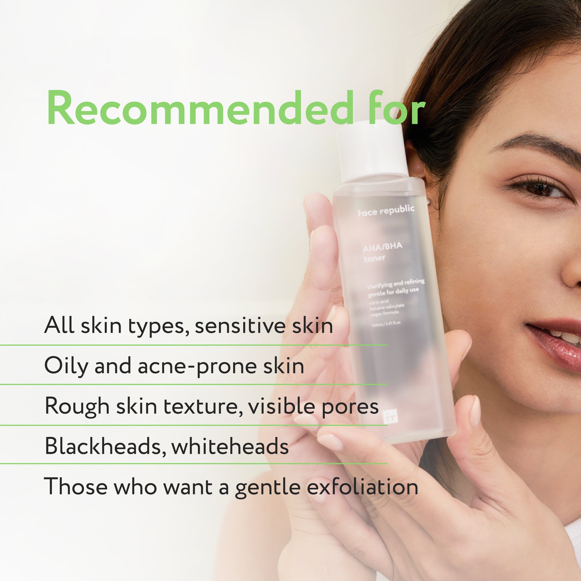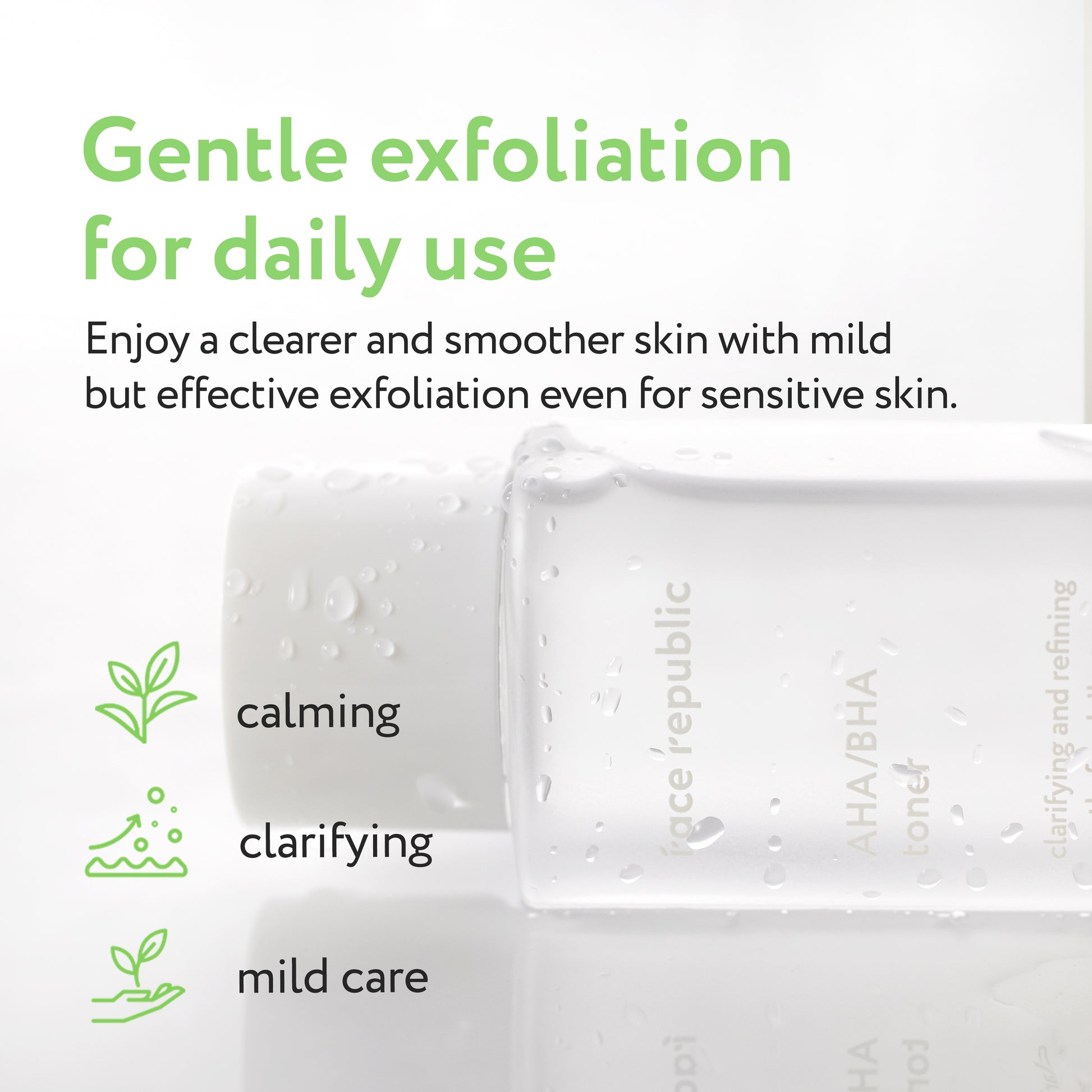 Face Republic AHA/BHA Toner is a gentle yet effective daily exfoliating toner designed to smooth skin texture and keep pores clear.