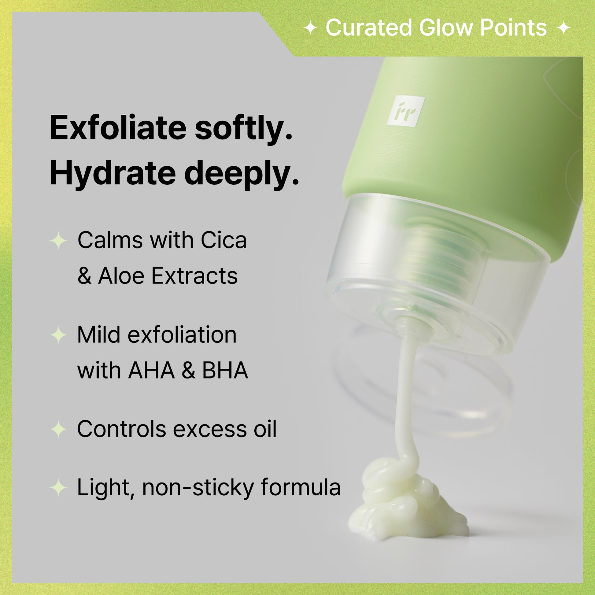 It calms tired and irritated skin with Centella Asiatica Extracts(Cica) and Aloe Extracts while deeply hydrating with plant-derived squalane. Infused with AHA and BHA, it helps control sebum, clarifies rough texture without irritation.