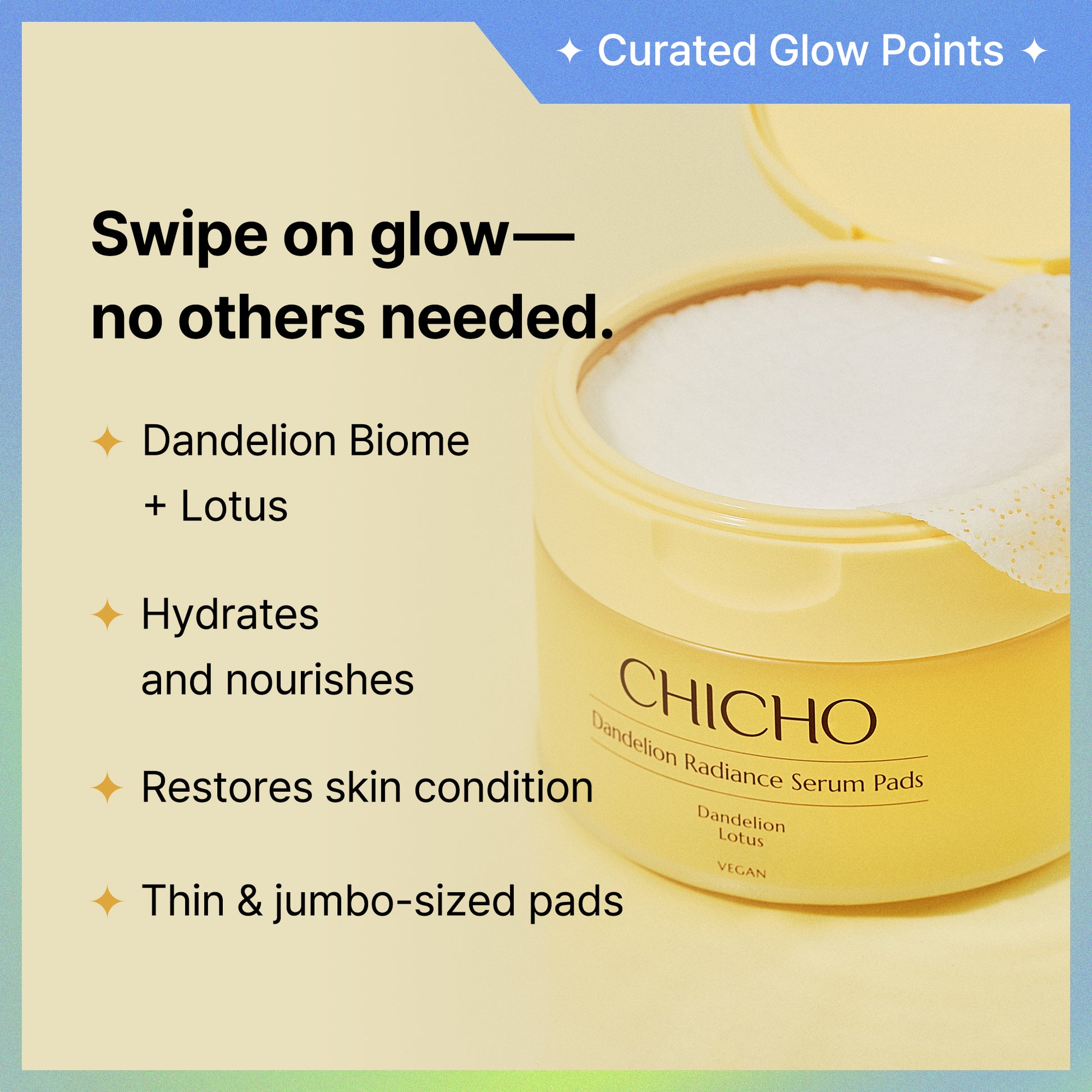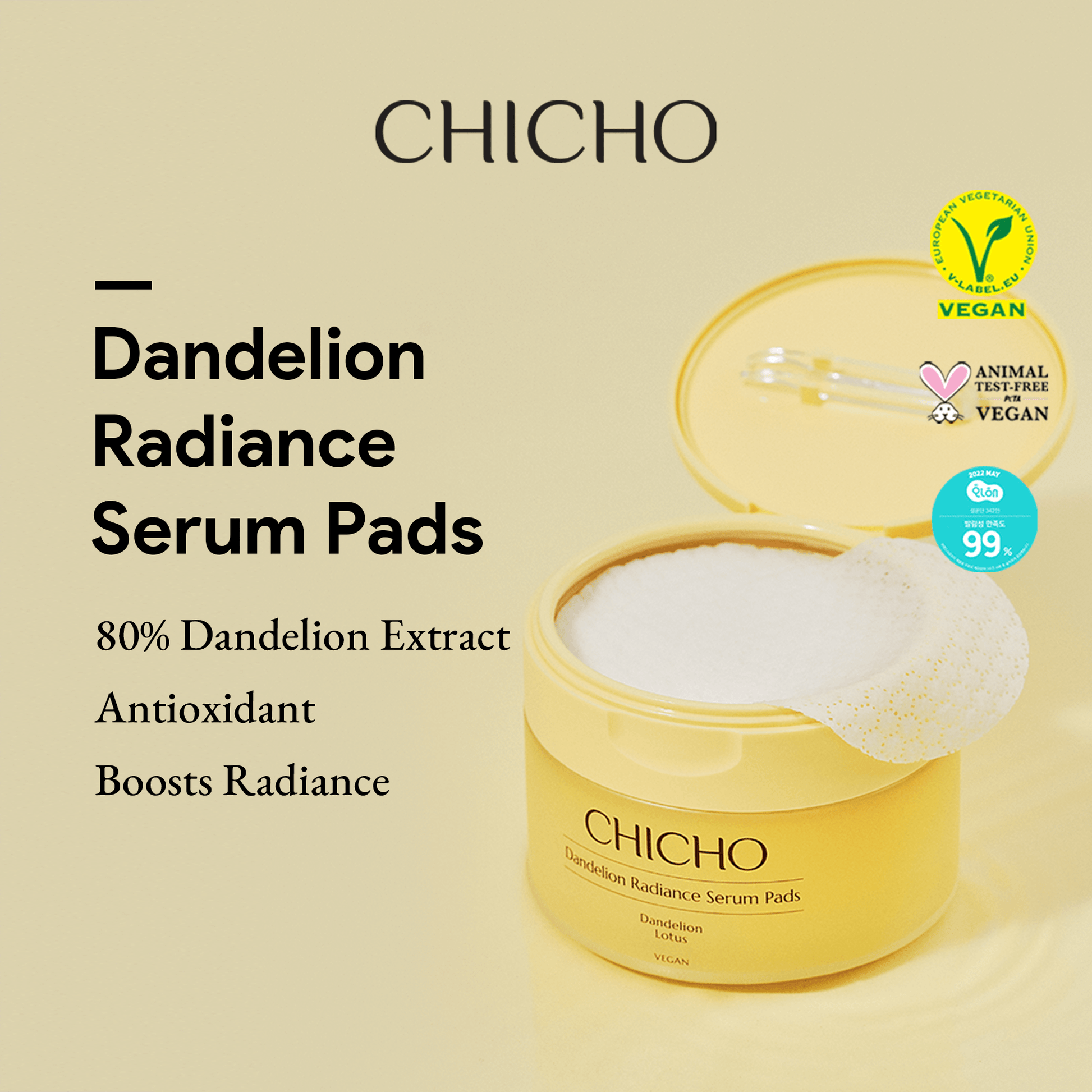CHICHO Dandelion Radiance Serum Pads are a daily skin booster soaked in Dandelion Biome—a blend of dandelion extract and fermented probiotics—to restore skin vitality and radiance.