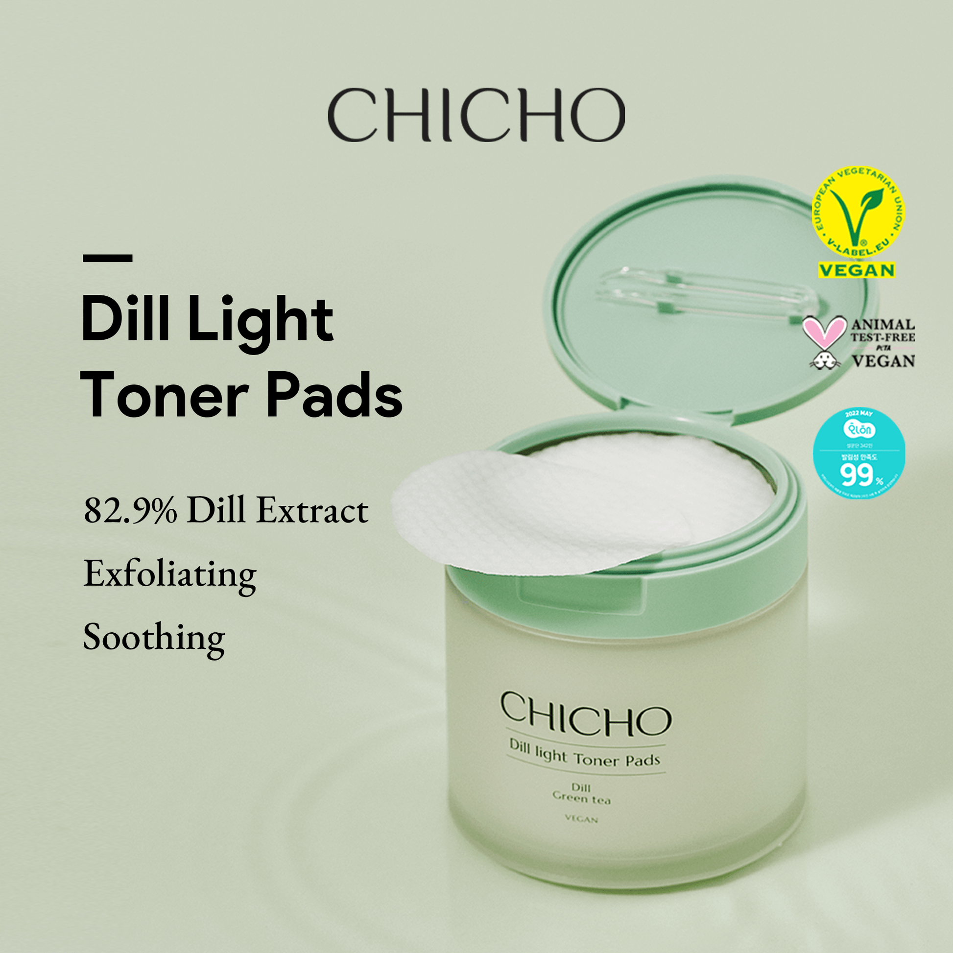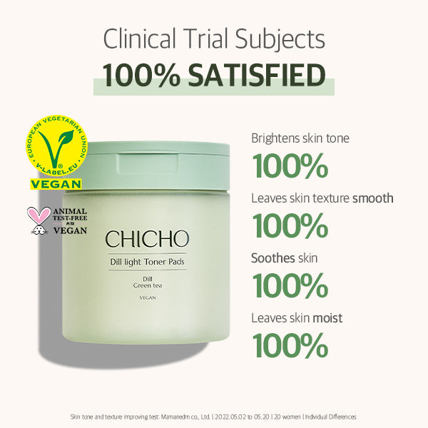 CHICHO Dill Light Toner Pads infused with Dill Extract smooths the skin texture and brightens the skin tone. Each pad is drenched in 82.9% Dill Extract, a time-honored herb known for its soothing and antioxidant properties, and paired with Green Tea for added hydrating benefits. It also contains Lipo-Barrier9™, CHICHO's patented nano-liposome complex, strengthens skin moisturizing barrier.