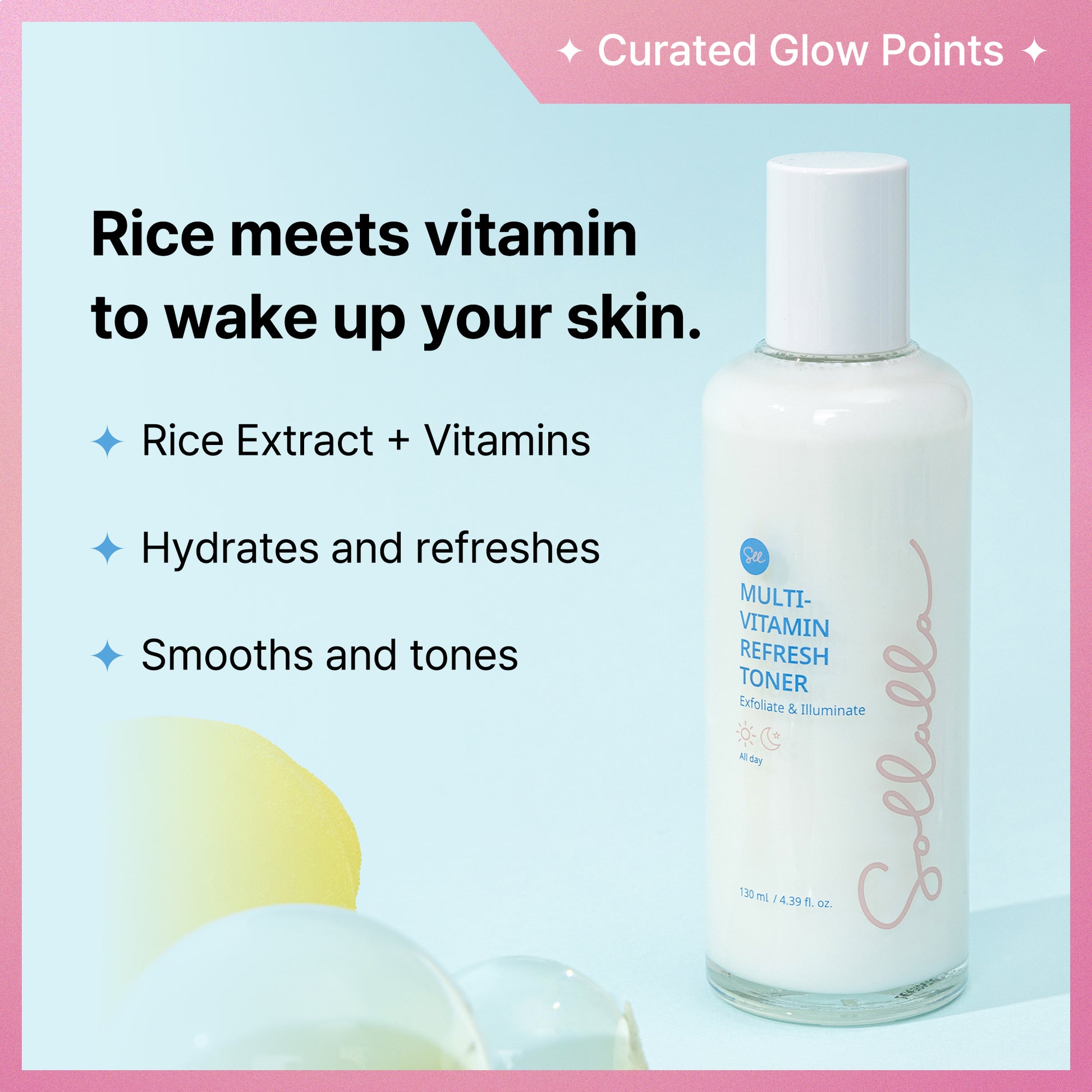 Sollalla Multi-Vitamin Refresh Toner is a vitamin-infused milky toner that preps and energizes your skin from the first step.