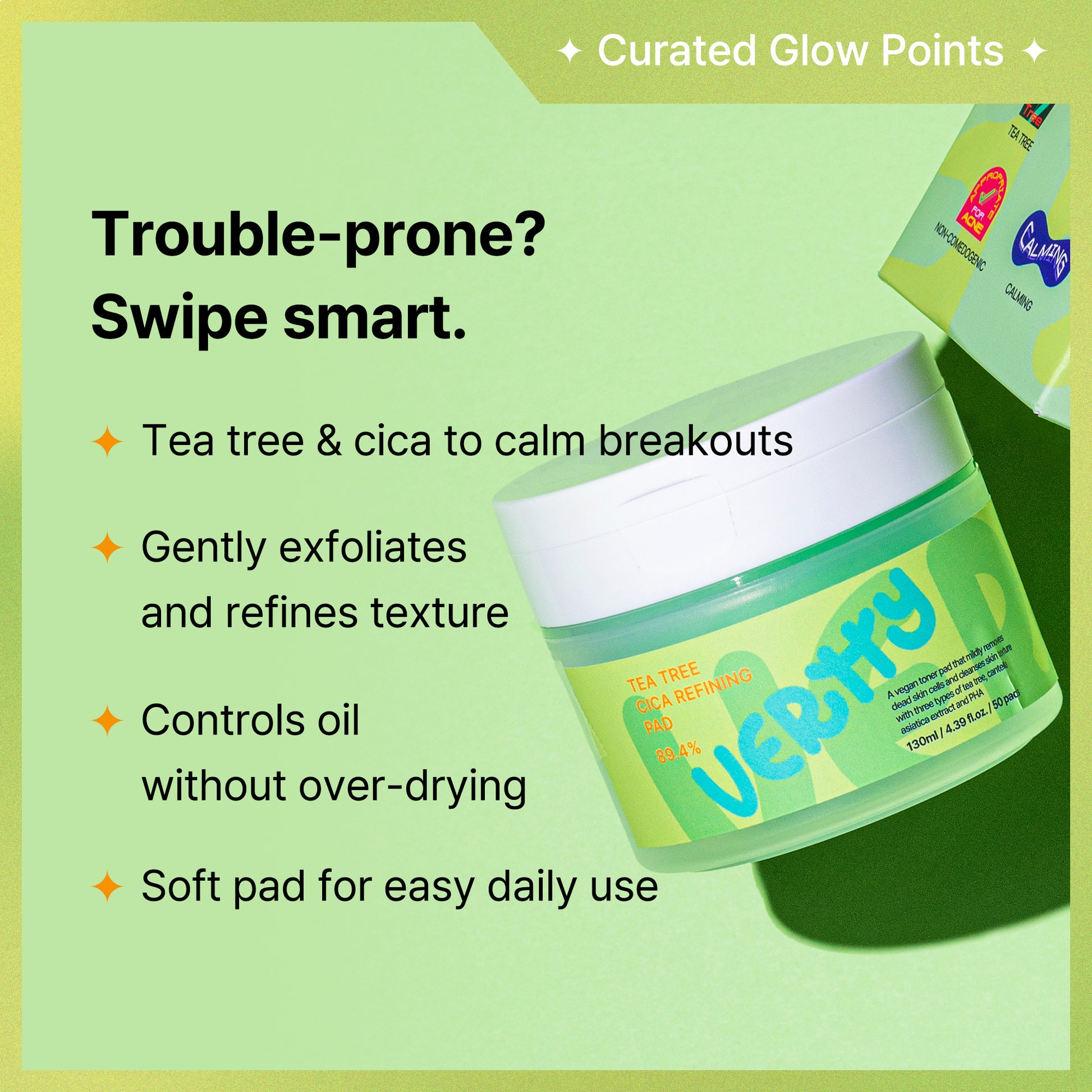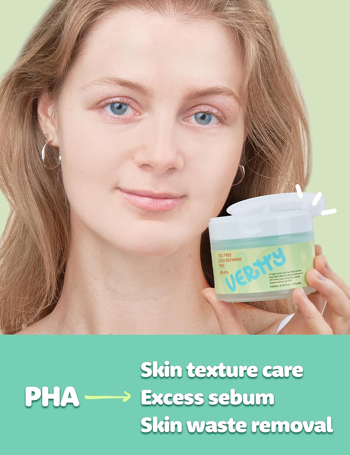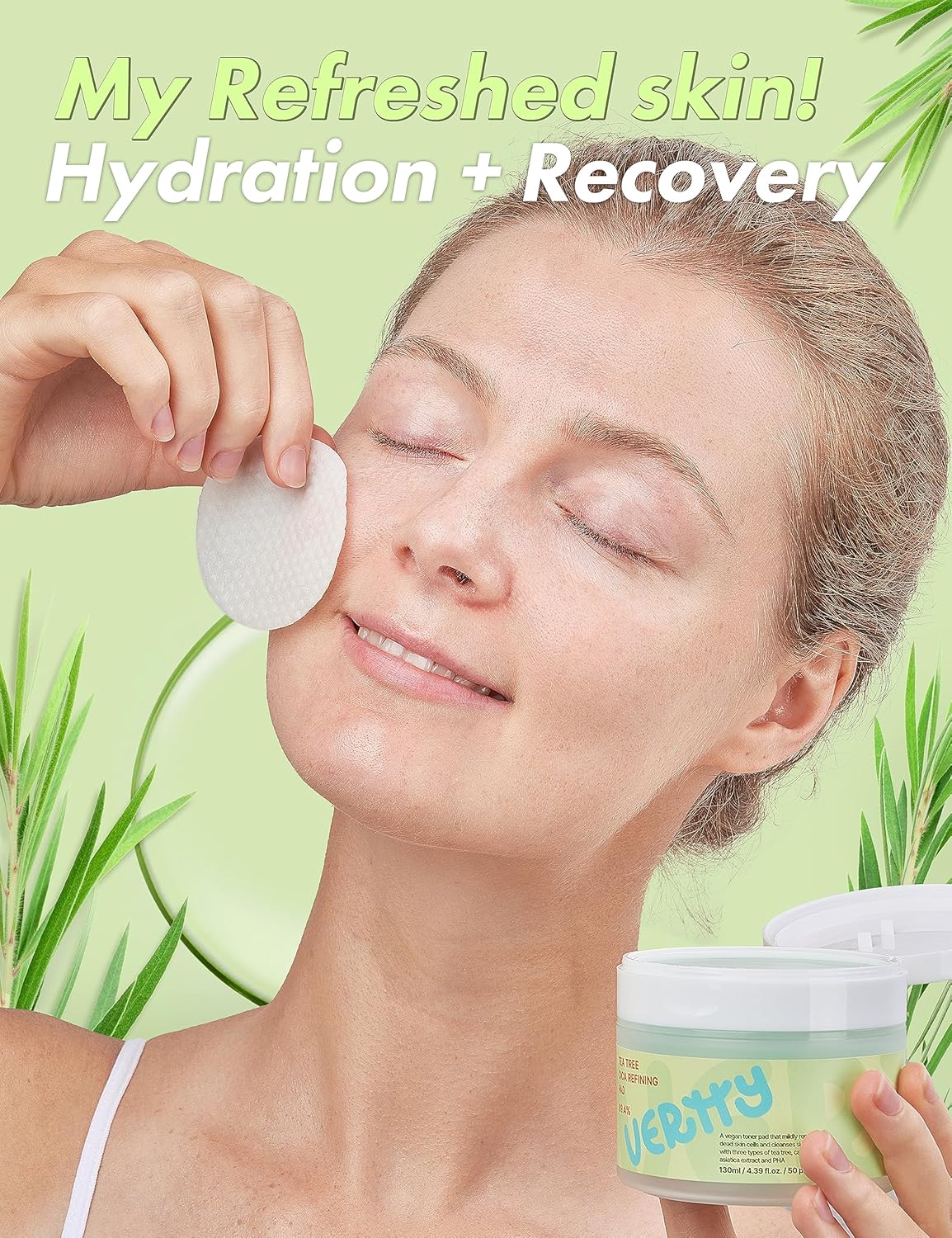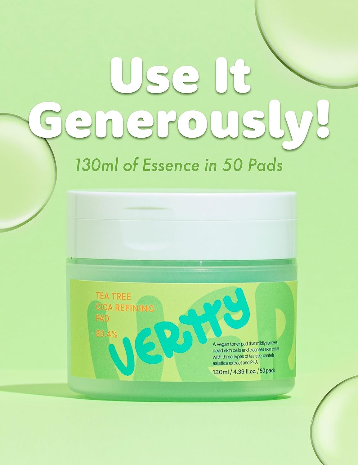 VERTTY Tea Tree Cica Refining Pad offers daily care for troubled, uneven skin with the perfect balance of calming and clarifying ingredients. Each pad is soaked in a soothing blend of tea tree and centella asiatica (cica) extract to help reduce irritation, control sebum, and gently exfoliate dead skin cells. The soft-textured pads glide effortlessly across the skin, refining texture while restoring comfort. Ideal for oily or sensitive skin types, these pads can be used morning or night to prep, reset, or calm your complexion with just one swipe.
